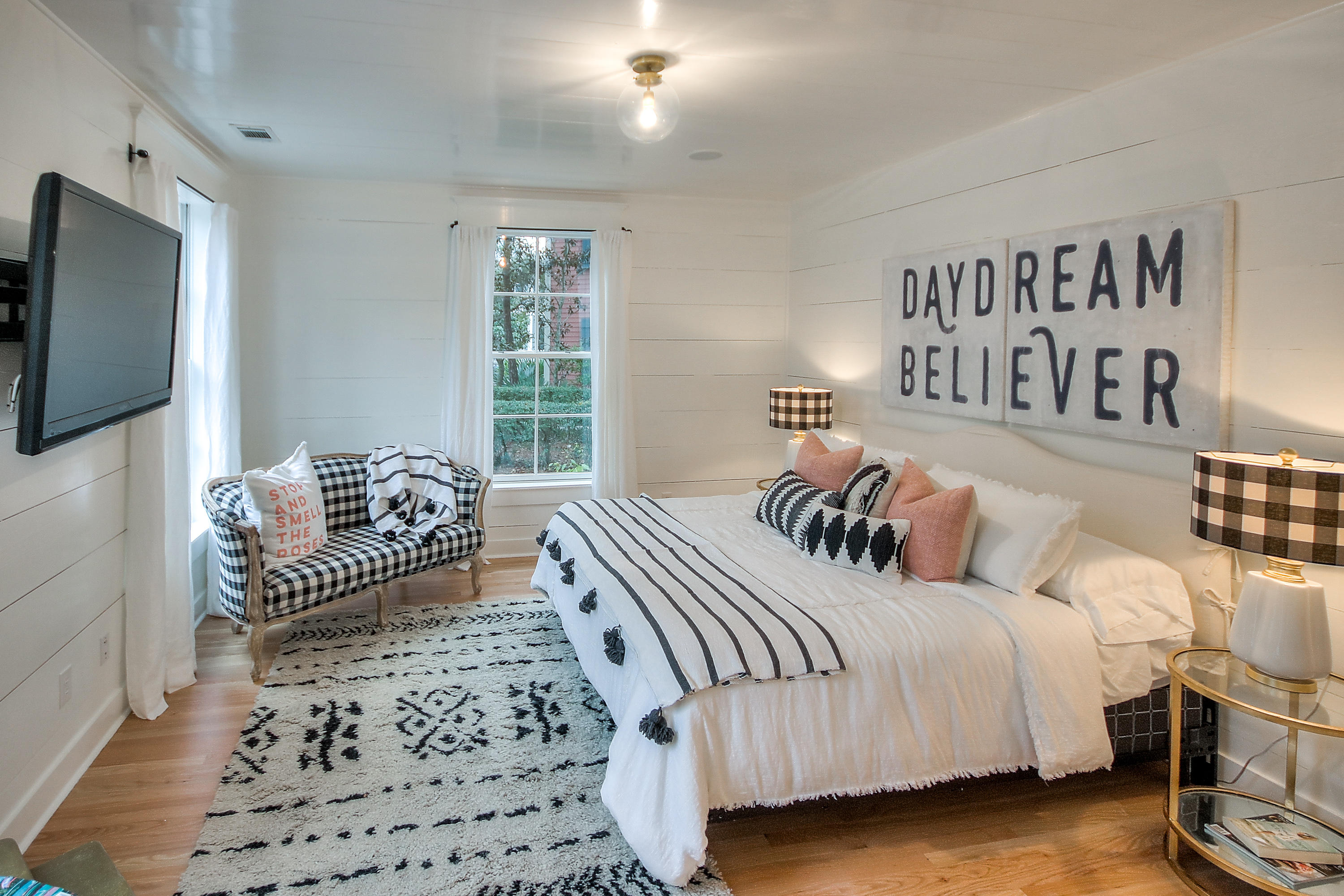 The upstairs has a bonus room great for reading, gaming, or flex space with daybed. The upstairs master has a king bed, ensuite bathroom with tile shower, and double sinks. The master closet has custom shelving. Off the master bedroom is a 16' x 10' deck with a daybed swing and with new table and chairs for that morning coffee or afternoon sunset.  The oversized guest bedroom has two twin bunkbeds, full size bed, desk, TV, walk-in closet with custom shelving, and an ensuite bathroom with tub shower combo and double sinks. This home sleeps 10 comfortably with beds for everyone.