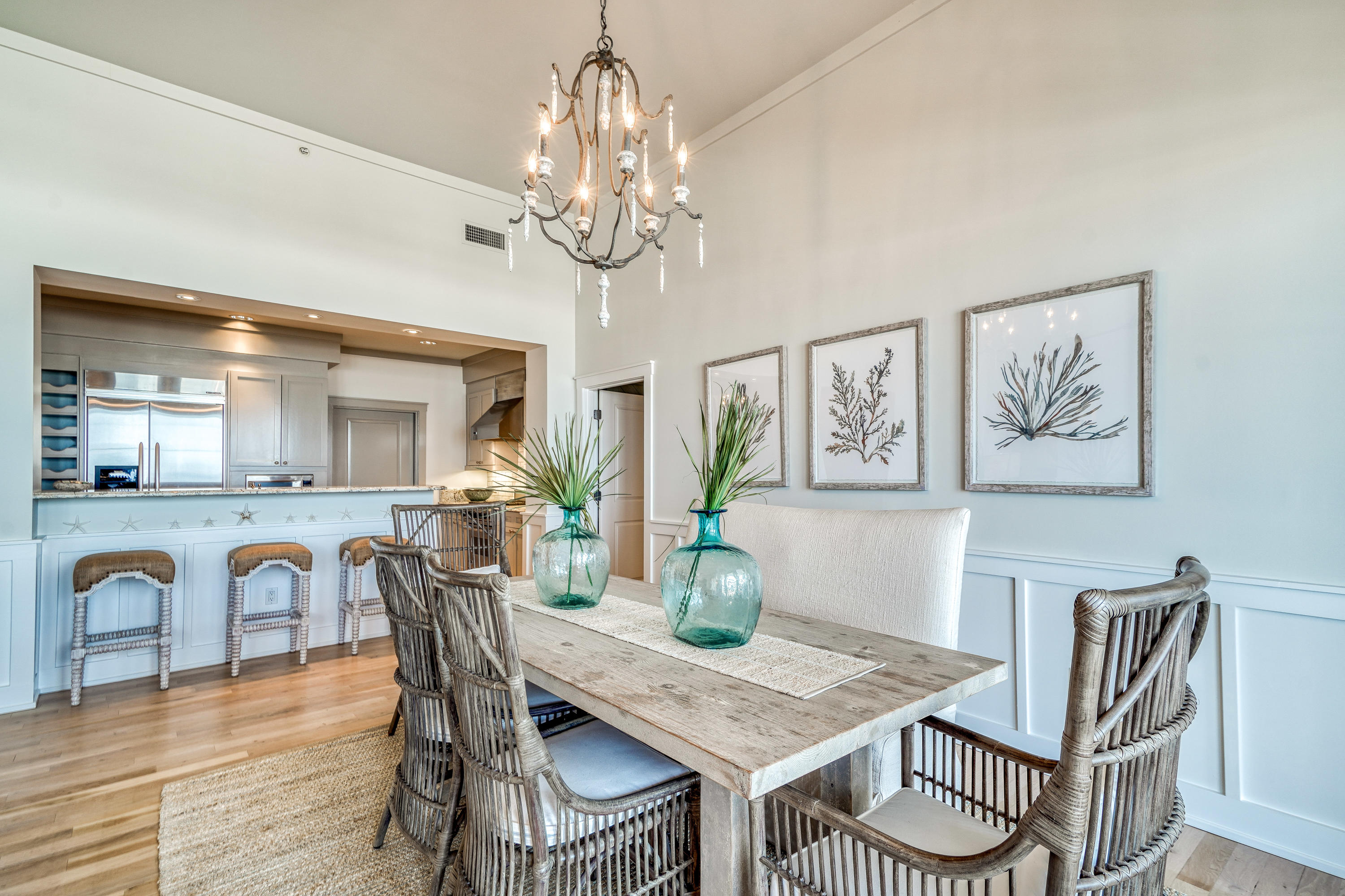 Luxury abounds in this beautifully appointed coastal home. Fully furnished to enjoy as a second home or incredible investment opportunity. Ideally situated on 30A, this home puts you in the epicenter of activity, while providing the peace and tranquility only a view of the sunset and waves can provide. The soaring 14-foot ceilings welcome you into an elegant and spacious family room with custom shutters, hardwood floors, and charming shiplap accent walls throughout. The Laguna floorplan encourages family gatherings with two master suites, one located conveniently on the first floor and the other on the second floor with a large balcony and gulf view.  Enjoy hours of fun with friends and family on the custom extended back patio.
