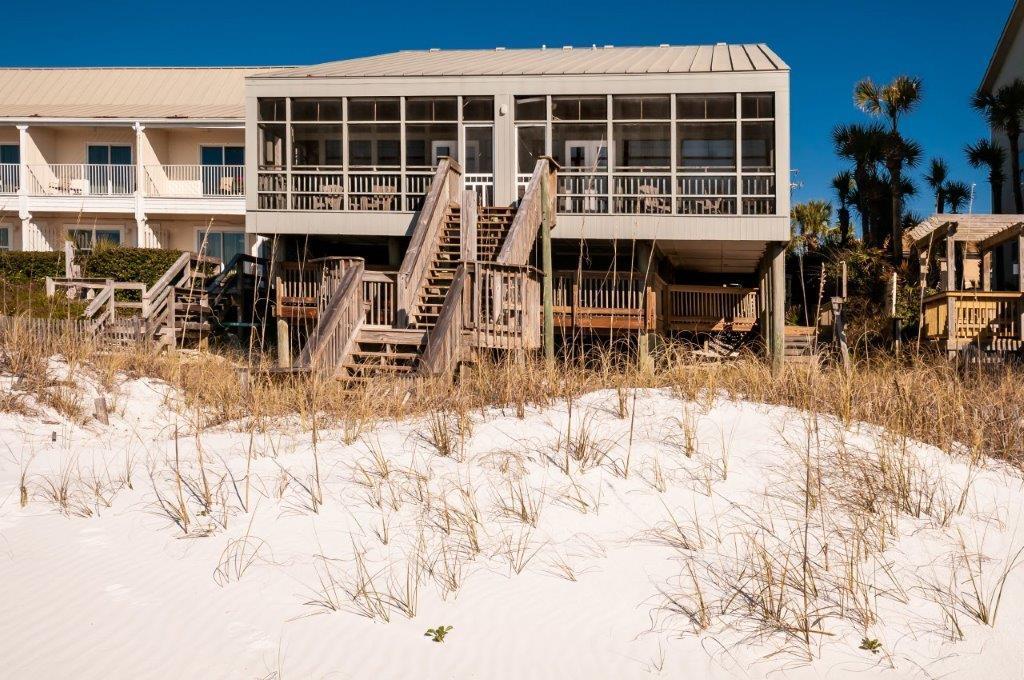 This unique gulf front Duplex in Crystal Beach with 60' of premium gulf frontage is a rare opportunity to own an authentic, Old Florida property that has been lovingly maintained by its owners for more than two generations. This two-story property is designed around an open living space with fully equipped kitchen and floor-to-ceiling windows that invite stunning views inside or out on the private screened porch. The upstairs loft includes a king bed & full bath with tub, and downstairs bunk room has twin beds and full bath with shower. Both units are identical. Other highlights include ample exterior parking, secure storage for beach equipment and outdoor shower. Great for vacation rentals, it generates around $80,000 in rental income with many owner stays. No association fees or H.O.A