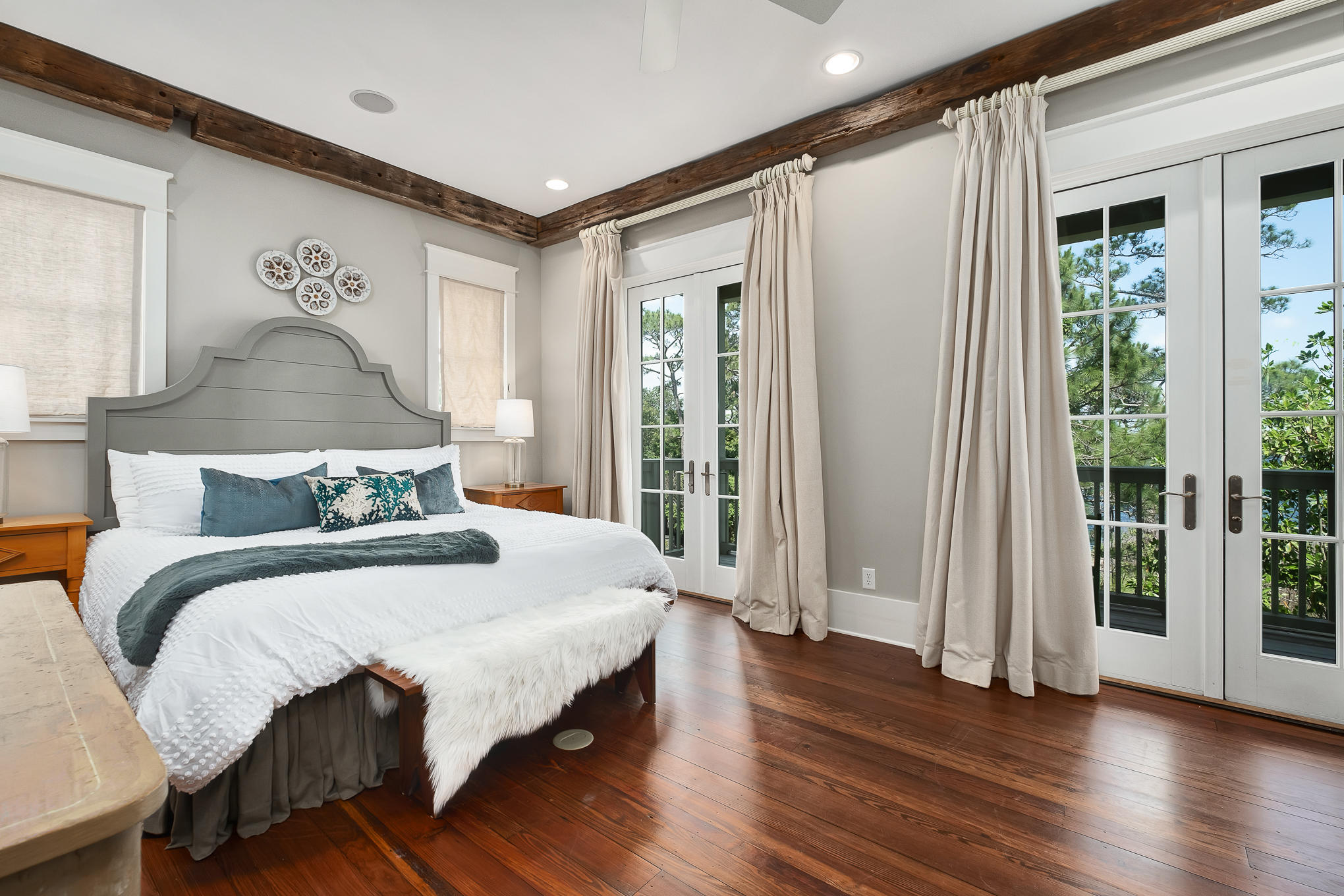 Stunning waterviews and dock access directly on Western Lake in beautiful Grayton Beach with no HOA fees. This custom craftsman style home was designed by architect Geoff Chick in 2006 and is nestled on a private road with mature trees in the heart of Grayton Beach.  Authentic heart of pine floors flow throughout the open floor plan and an abundance of French doors and windows, optimize the majestic Western Lake views from the living room, kitchen and dining area. The master bedroom has a private balcony overlooking the lake and dock, gorgeous pine beams serve as crown molding, large walk-in closet and private bathroom with double vanity and spacious walk in shower.  Down the hall are 2 additional bedrooms with en-suite baths.  The second floor offers two bedrooms and one can easily
