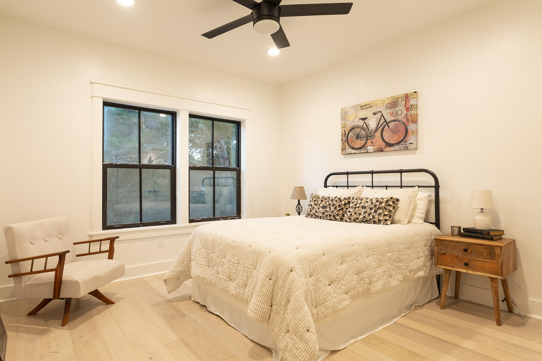 Upon entering this custom built residence in The Preserve at Grayton Beach, one is greeted by elevated luxury and thoughtful design. Constructed by Simmons Custom Homes, the property encompasses over 3,490 square feet of meticulously refined living space. The home presents a neutral color palette, 12-foot ceilings, a Venetian plaster fireplace wall, and an array of upscale finishes, including crystal accents, rattan, wrought iron, white oak flooring, linen, and Taj Mahal quartzite countertops. These features collectively foster a serene and welcoming environment well-suited for both relaxation and entertaining.The main floor seamlessly integrates indoor and outdoor living through a retractable sliding glass wall, connecting the porch and primary living area for uninterrupted versatility. Additional amenities include a half bath, a guest room with ensuite bath, a walk-in laundry room, and a three-stop elevator. The second floor offers two further guest bedrooms, each with private ensuite baths, in addition to the expansive Primary Suite. The Primary Suite occupies much of the floor, featuring a spacious bedroom, an oversized bath with soaking tub and enclosed shower, a walk-in closet with custom vanity, and private access to a secondary laundry room.