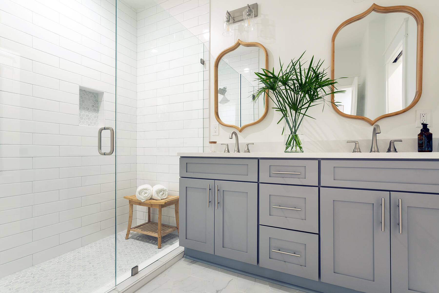 "	Spa inspired bathroom with jetted tub, large walk in shower, and dual vanities