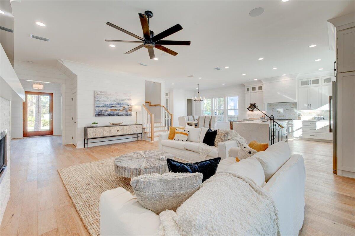 Upon entering this custom built residence in The Preserve at Grayton Beach, one is greeted by elevated luxury and thoughtful design. Constructed by Simmons Custom Homes, the property encompasses over 3,490 square feet of meticulously refined living space. The home presents a neutral color palette, 12-foot ceilings, a Venetian plaster fireplace wall, and an array of upscale finishes, including crystal accents, rattan, wrought iron, white oak flooring, linen, and Taj Mahal quartzite countertops. These features collectively foster a serene and welcoming environment well-suited for both relaxation and entertaining.The main floor seamlessly integrates indoor and outdoor living through a retractable sliding glass wall, connecting the porch and primary living area for uninterrupted versatility. Additional amenities include a half bath, a guest room with ensuite bath, a walk-in laundry room, and a three-stop elevator. The second floor offers two further guest bedrooms, each with private ensuite baths, in addition to the expansive Primary Suite. The Primary Suite occupies much of the floor, featuring a spacious bedroom, an oversized bath with soaking tub and enclosed shower, a walk-in closet with custom vanity, and private access to a secondary laundry room.
