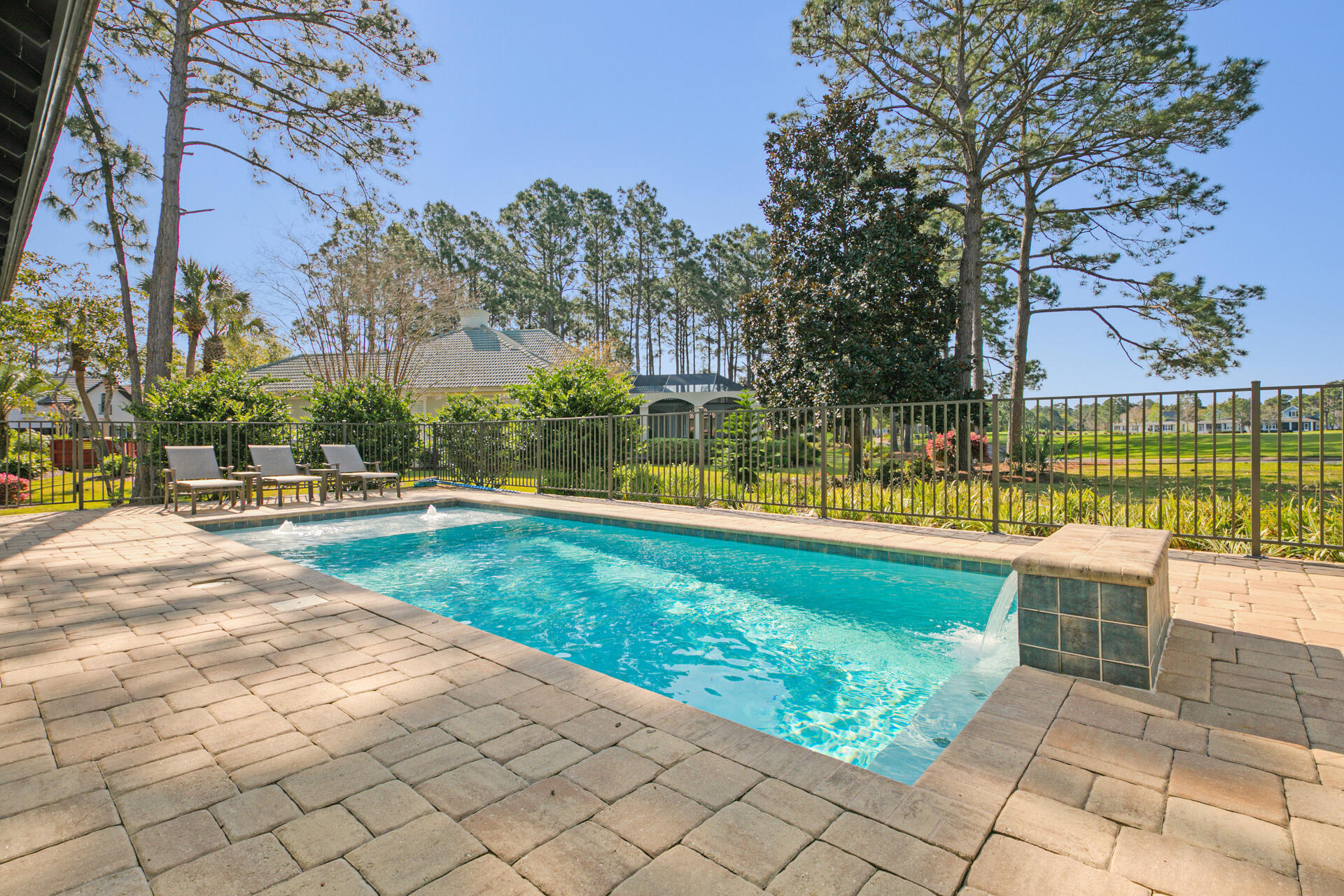 Almost new and immaculate home in the coveted Island Green neighborhood of the Sandestin Golf and Beach Resort, this stunning home features 3,782 square feet of thoughtfully designed spaces with four bedrooms plus a bunk room, four full bathrooms, and two half bathrooms. Custom built in 2018 by Turner Legacy Homes, warm toned hardwood floors contrast with crisp white walls with high ceilings and beautiful millwork. The spacious living area is highlighted by a striking coffered ceiling and sliding doors that fully open to an expansive covered porch with outdoor kitchen and gas fireplace overlooking the private pool and picturesque greens of the 2nd hole and 3rd tee box of the Raven Golf Course. A pool bath and storage room provide added convenience for an afternoon soaking up the sun at