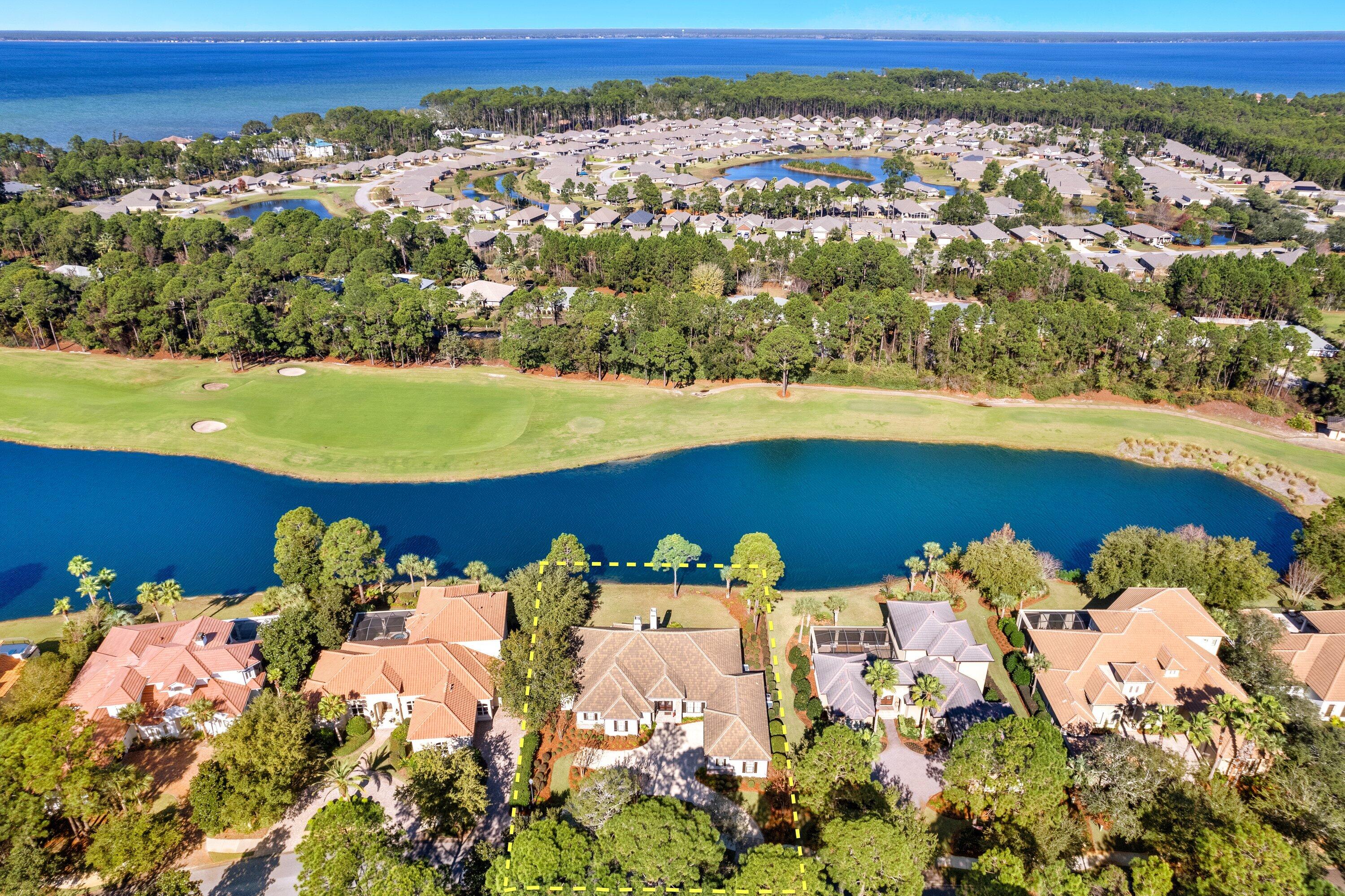 Experience Sandestin at its finest in this beautifully reimagined coastal retreat, set on one of the most spectacular lake and golf course vistas in all of the resort. Thoughtfully renovated from top to bottom, this home blends high-end design, modern comforts, and effortless livability, set within the serene, rental-restricted enclave of Del Mar. With a front-row lakeside seat to the number four fairway of the Baytowne Golf Course and sweeping views that stretch across holes two, three, and beyond, this private oasis offers a rare combination of beauty, tranquility, and convenience, just a quick golf cart ride from the world's most beautiful beaches, Grand Boulevard, Baytowne Wharf, dining, shopping, and everyday essentials.A newly added entry foyer with soaring  ceilings welcomes you home and immediately sets the tone for the elevated finishes found throughout. Step inside to an open, light-filled living space anchored by brand-new floor-to-ceiling ten-by-twelve Euro doors that fully accordion open, creating a seamless indoor and outdoor connection and framing postcard-worthy views of the pool, lake, and golf course beyond. Petrified wood porcelain tile floors flow throughout this space, providing a sophisticated foundation for the home's serene palette of blues, golds, and natural tones.