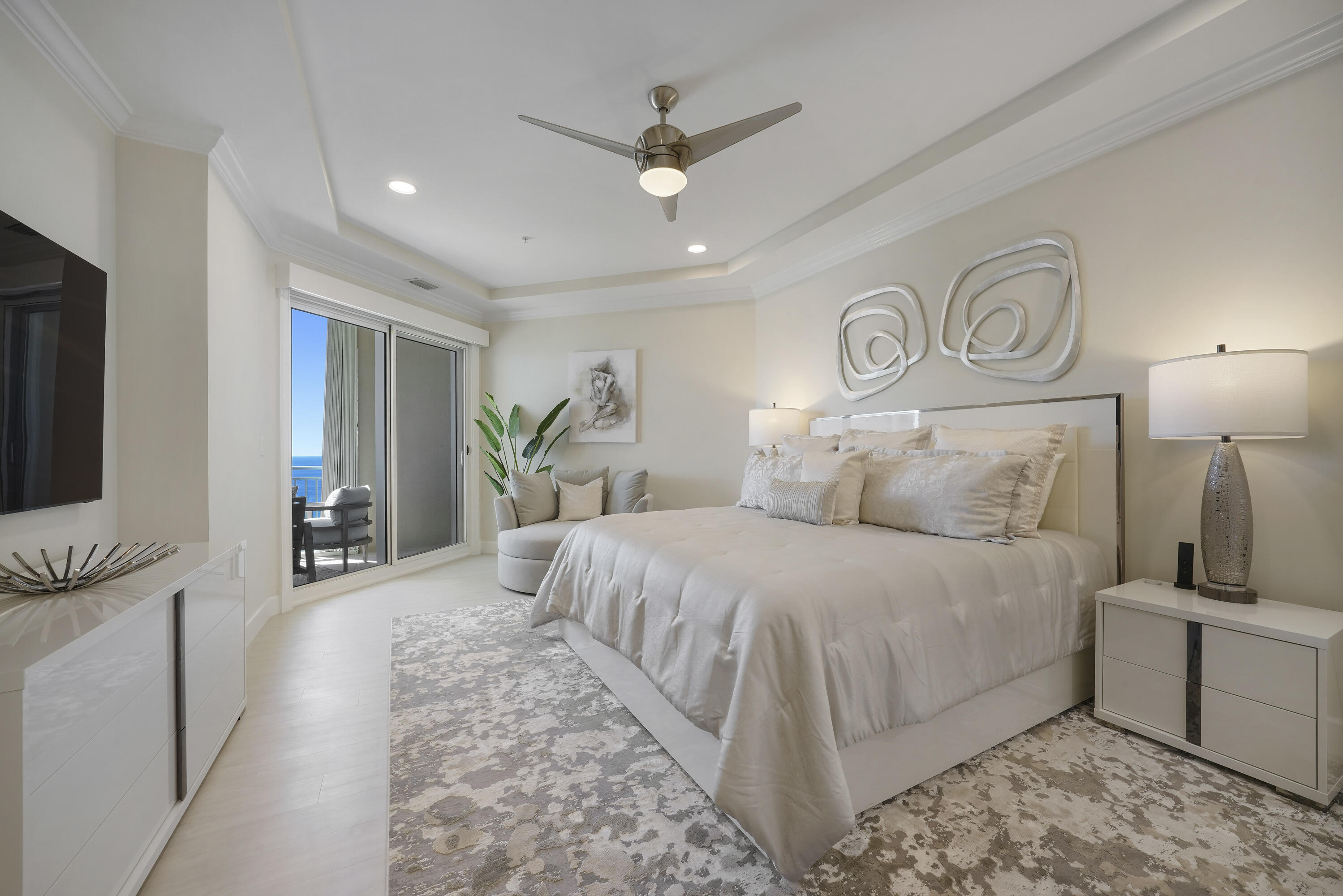 The Gulf-front Primary Suite is a private retreat showcasing tray and coffered ceilings, a relaxing sitting area, dual walk-in closets, and a built-in safe. The Primary Bath offers new dual vanities topped with cascading ALEXANDRITA QUARTZITE waterfall countertops, paired with new sinks and modern hardware for a refined, spa-like feel. A doorless walk-in shower with multiple spray options and a jetted soaking tub surrounded in travertine create the perfect retreat for relaxation. LED mirrors and a sparkling crystal chandelier with retractable fan blades elevate the space with style, while a separate water closet with an ergonomic-height toilet adds both comfort and privacy.