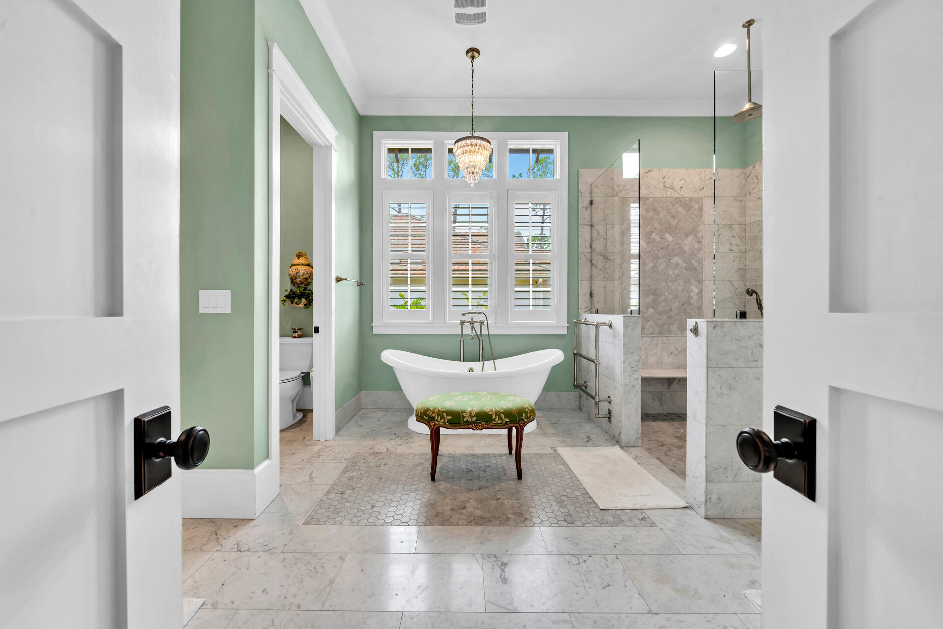 The Gulf-front Primary Suite is a private retreat showcasing tray and coffered ceilings, a relaxing sitting area, dual walk-in closets, and a built-in safe. The Primary Bath offers new dual vanities topped with cascading ALEXANDRITA QUARTZITE waterfall countertops, paired with new sinks and modern hardware for a refined, spa-like feel. A doorless walk-in shower with multiple spray options and a jetted soaking tub surrounded in travertine create the perfect retreat for relaxation. LED mirrors and a sparkling crystal chandelier with retractable fan blades elevate the space with style, while a separate water closet with an ergonomic-height toilet adds both comfort and privacy.