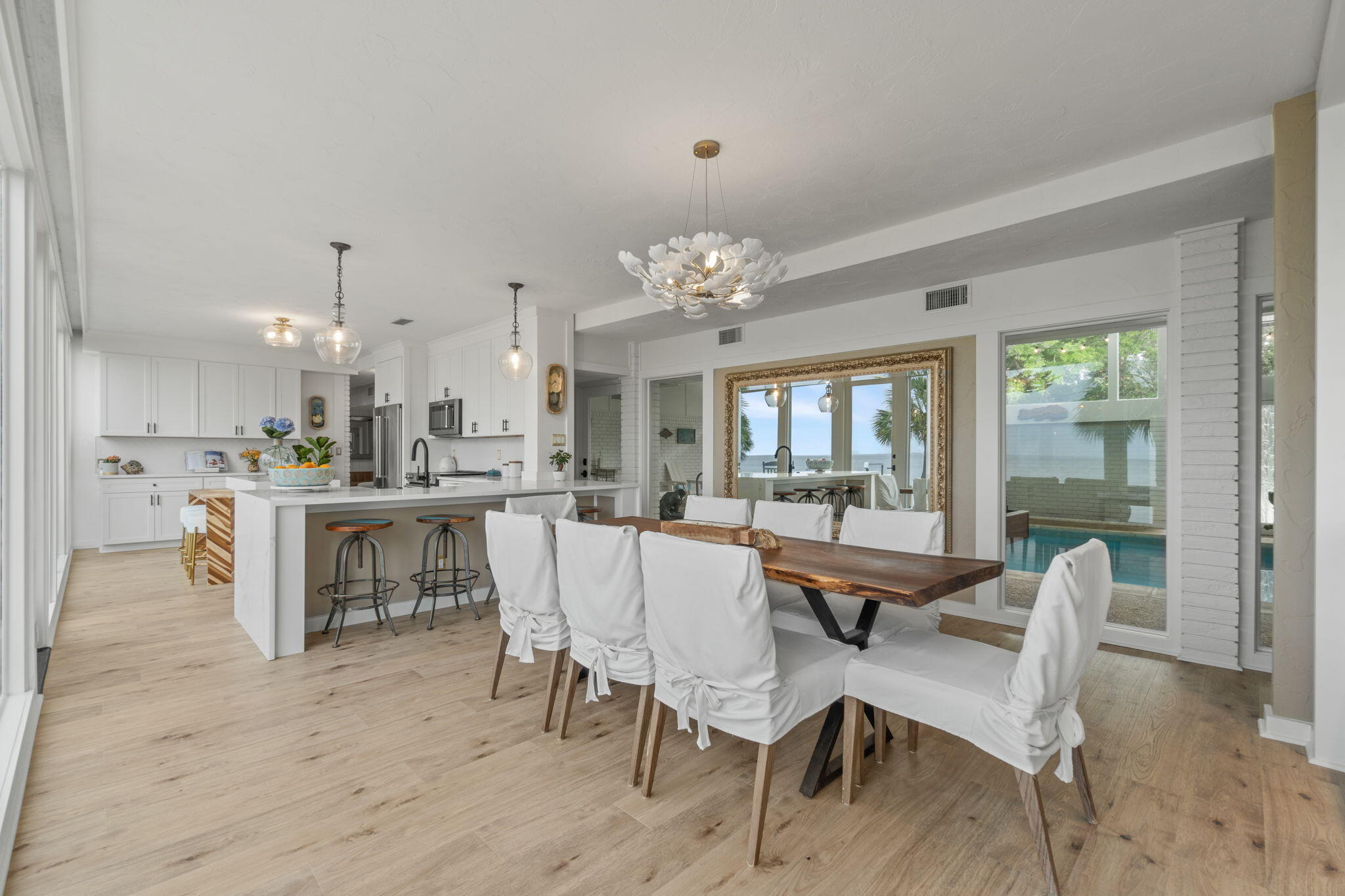 Beautifully renovated and turn key estate in sought after yacht club neighborhood. 4 bed 4 bath, 4137 square ft; with an additional ~1200 sq indoor pool area/ workout room. Large lot with expansive front and backyard creating a very private feeling. 150' water frontage that includes new wear deck dock with expanded sitting areas; fish and crab from your own backyard. The home is nearly 90ft long with tall expansive windows which creates views from just about every room in the home including even the laundry room. The water behind the home is about as good as it gets being able to swim and wade out hundreds of feet. 5 min boat ride to crab island and local beaches. Exceptional morning sunrises, views across the bay to Destin including Destin's weekly fireworks. Sip on your morning.