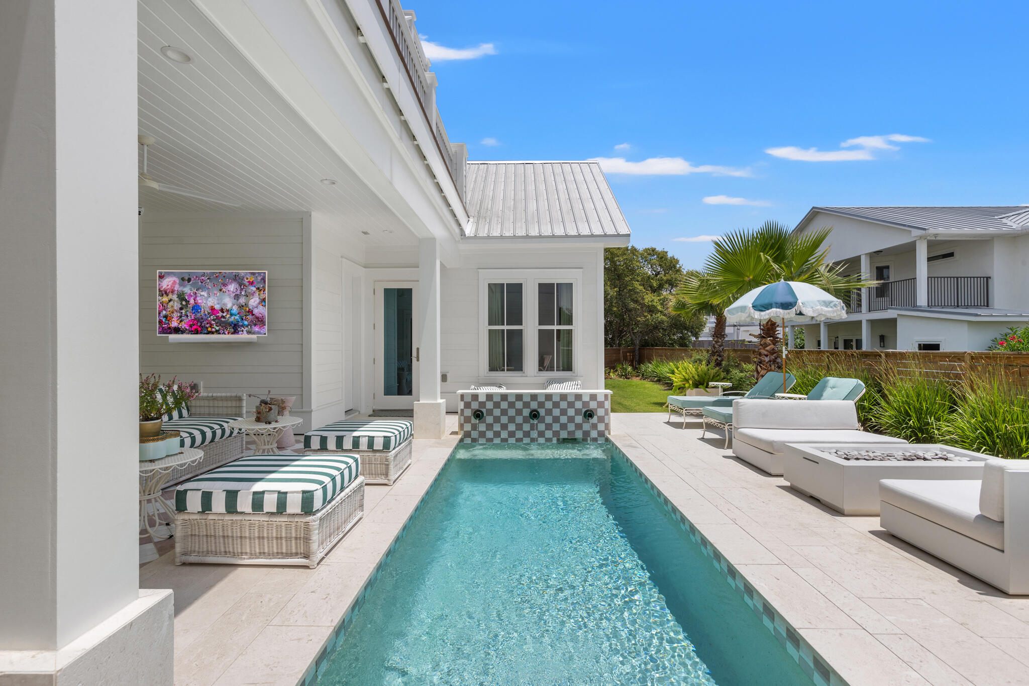 Under contract - Accepting Back up offers.  Exquisite Coastal lake house at 122 Camp Creek Rd South!  Discover the epitome of coastal luxury at 122 Camp Creek Rd South, a custom-designed masterpiece by renowned architect Greg Jazereyi. Nestled on a tranquil, oak-canopied street on the coveted east end of 30A, this serene lakehouse blends sophisticated design with the natural beauty of its surroundings. Positioned just one tier back from the rare Coastal Dune Lake, the property features a brand-new dock directly across the street, offering effortless access to fishing, paddle boarding, kayaking, and the Gulf of Mexico via the lake's outflow. This expansive residence boasts 5 bedrooms, including two luxurious primary suites, and 5.5 bathrooms, designed for ultimate comfort and privacy. The first floor welcomes you with an open-concept layout, featuring 20-foot ceilings, wood-paneled walls, and large windows that flood the space with natural light. The gourmet kitchen is a chef's dream, appointed with custom natural oak cabinetry, Taj Mahal quartzite countertops, an oversized island, premium Thermador appliances, and a walk-in pantry. The adjacent living room, accented by white oak ceilings and reclaimed beams, and fireplace flows seamlessly to the outdoor living area through a large Eurowall slider. The outdoor oasis is an entertainer's paradise, complete with a covered living area featuring an outdoor fireplace, white oak ceilings, a summer kitchen with a grill, ice machine, and beverage cooler, and a heated saltwater pool and hot tub surrounded by shell stone pavers and low-maintenance artificial turf. Connected to this space is a charming carriage house, offering a cozy guest retreat with shell stone tile floors, vaulted white oak ceilings, a kitchenette, and a full bathroom.
